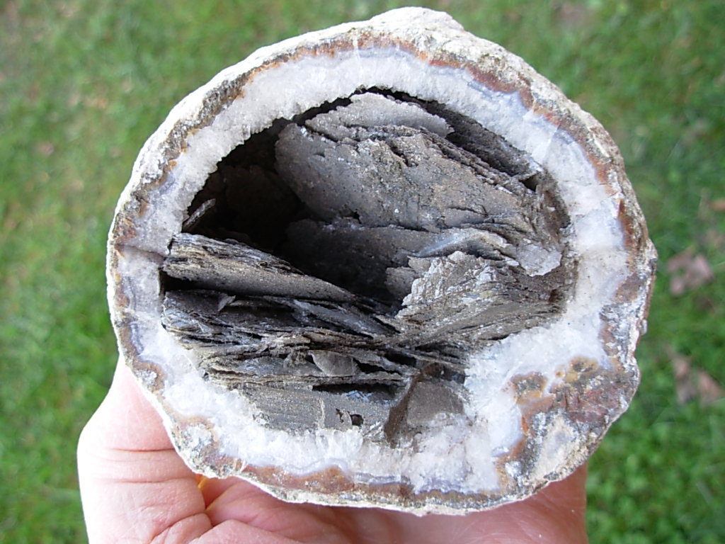 10.1 cm (4 inch) Cracked Open Las Choyas Geode Half with Selenite Blades Vug 6
