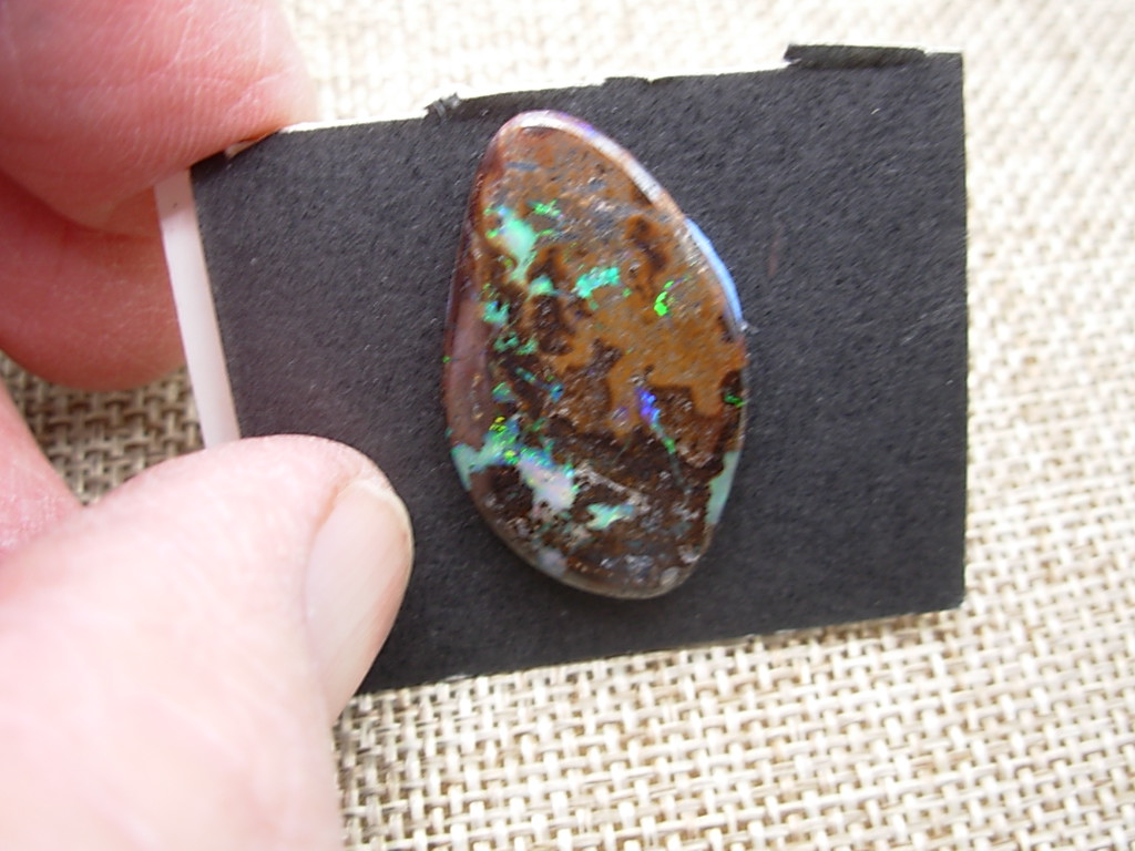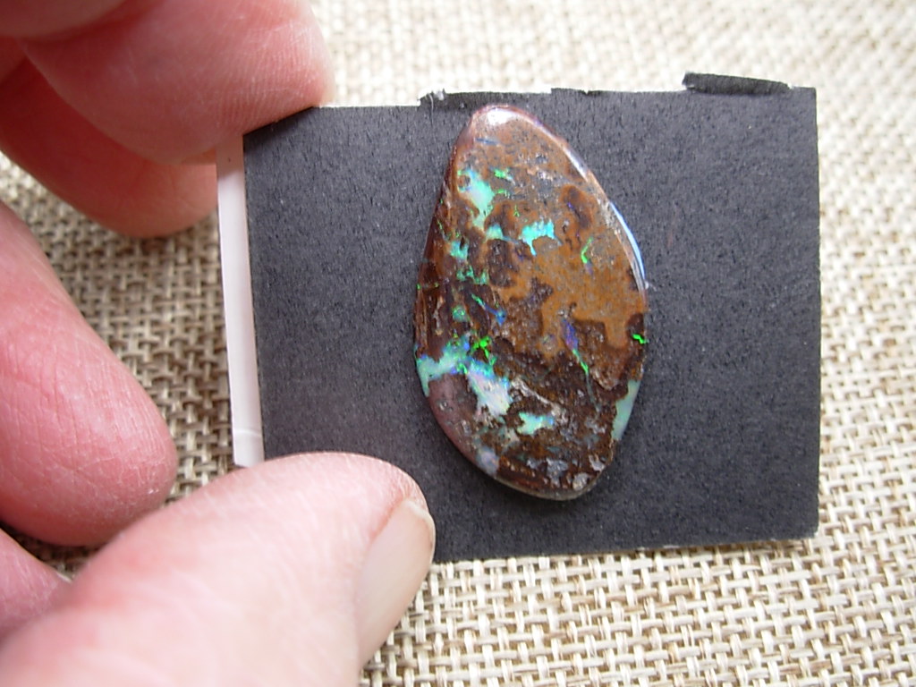 This is a beautiful 30 x 18 mm Cabochon that is 2mm thick. It has a mix of dark and light brown ironstone with blue and white opal and very nice multiple green flash spots. This is an old stock specimen that came from the 36+ year collection of E&L Roth.