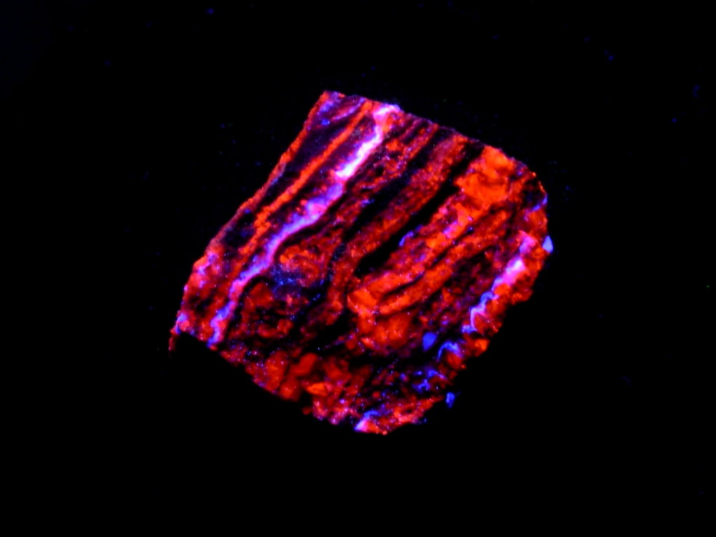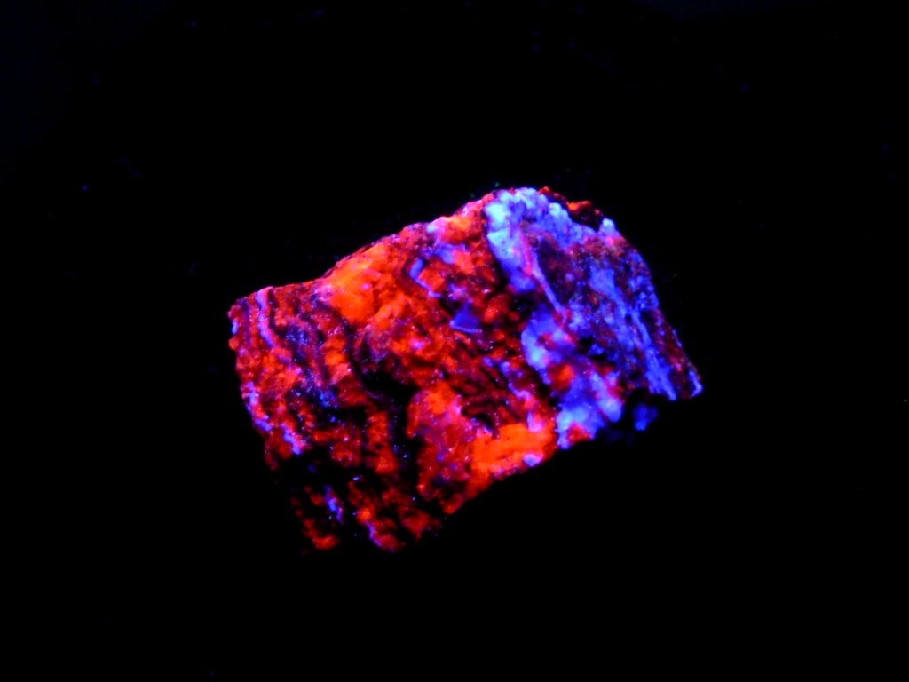 From the Pure Potential Mine (North Geronimo Mine), Silver District, Trigo Mts, La Paz Co., Arizona. This is a 2-color combination of violet Fluorite and Orange-red Calcite. This is an amazingly unique specimen that explodes in color under SW, MW and LW Ultra-Violet light! (We like all 3 at the same time on these specimens!) Fluorescent Photos taken under a Way Too Cool Triple Wave 254/312/368 nm SW/MW/LW 9-Watt Lamp in a blackout box.