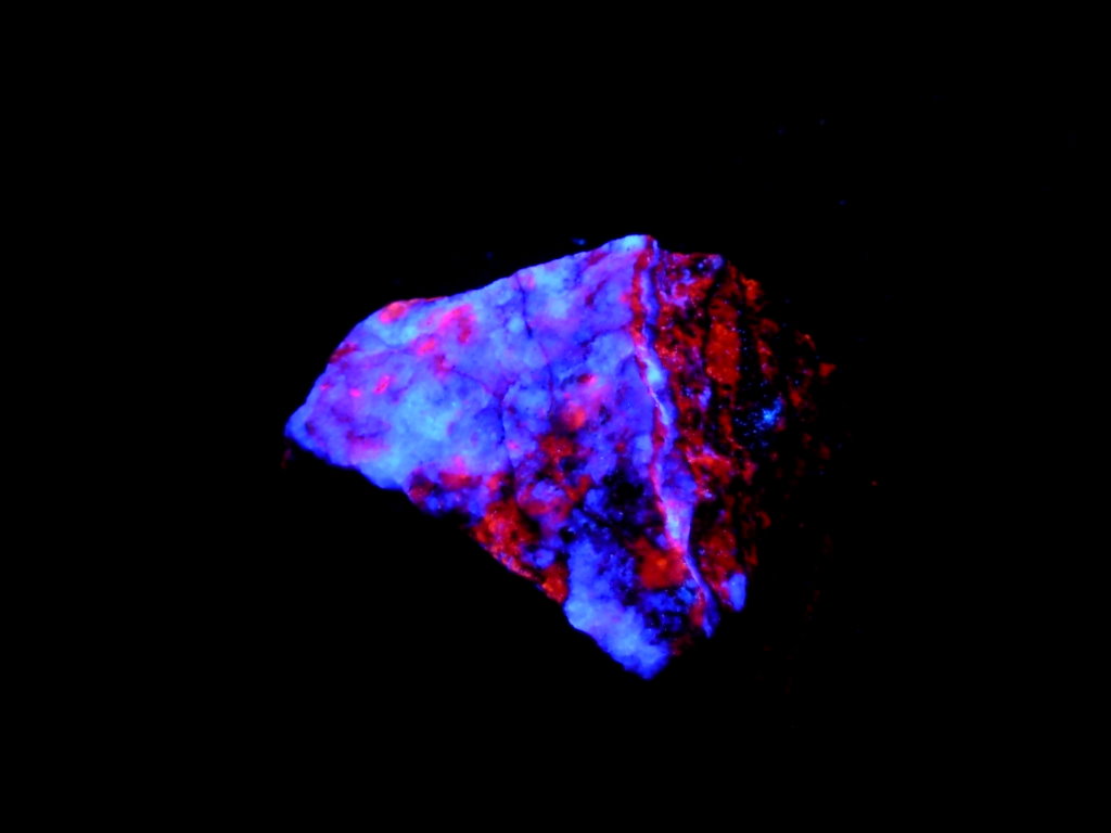 From the Pure Potential Mine (North Geronimo Mine), Silver District, Trigo Mts, La Paz Co., Arizona. This is a 2 color combination of violet Fluorite and Orange-red Calcite. This is an amazingly unique specimen that explodes in color under SW, MW and LW Ultra-Violet light! (We like all 3 at the same time on these specimens!) Fluorescent Photos taken under a Way Too Cool Triple Wave 254/312/368 nm SW/MW/LW 9-Watt Lamp in a blackout box.