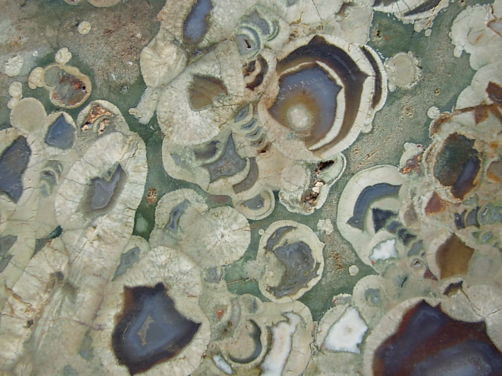 It is a volcanic rock with high silica content that is formed by eruptions of granitic magmas. Granitic magmas are very dense and cool slowly allowing a lot of time for large crystalline structures called phenocrysts to form in the spherical cavities (orbs) created by gas bubbles in the flow. These cavities are often lined with opal and tridymite. The phenocrysts are typically silica based minerals such as quartz and chalcedony of different colors and are what give rainforest jasper its unique appearance. The stone is also known as rainforest rhyolite, orbicular jasper and spherulitic rhyolite.
