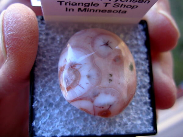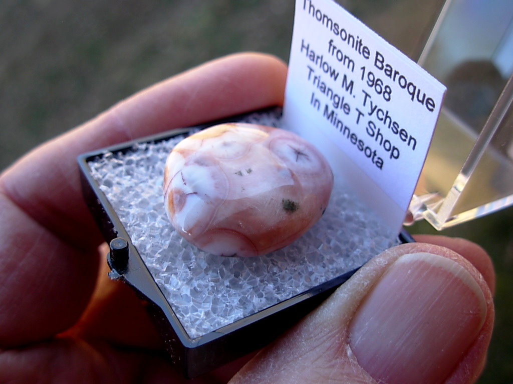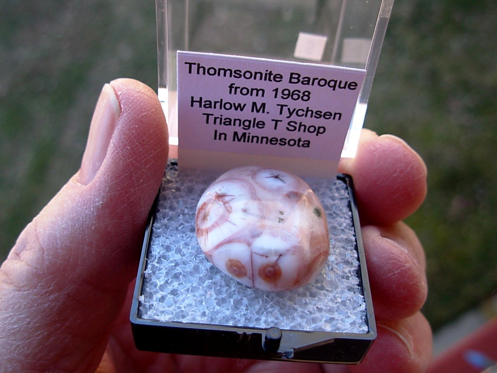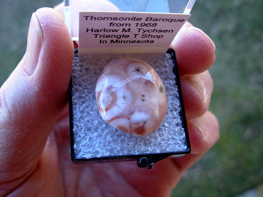 Minnesota Thomsonite is a RARE zeolite mineral found only at the Lake Superior shoreline SW of Grand Marais. This specimen is from Harlow Tyschen’s Triangle T Thomsonite Shop in 1968. He owned this locale from 1942 to 1974. This piece has not been available for over 57 years. It came from the John J Newton collection.