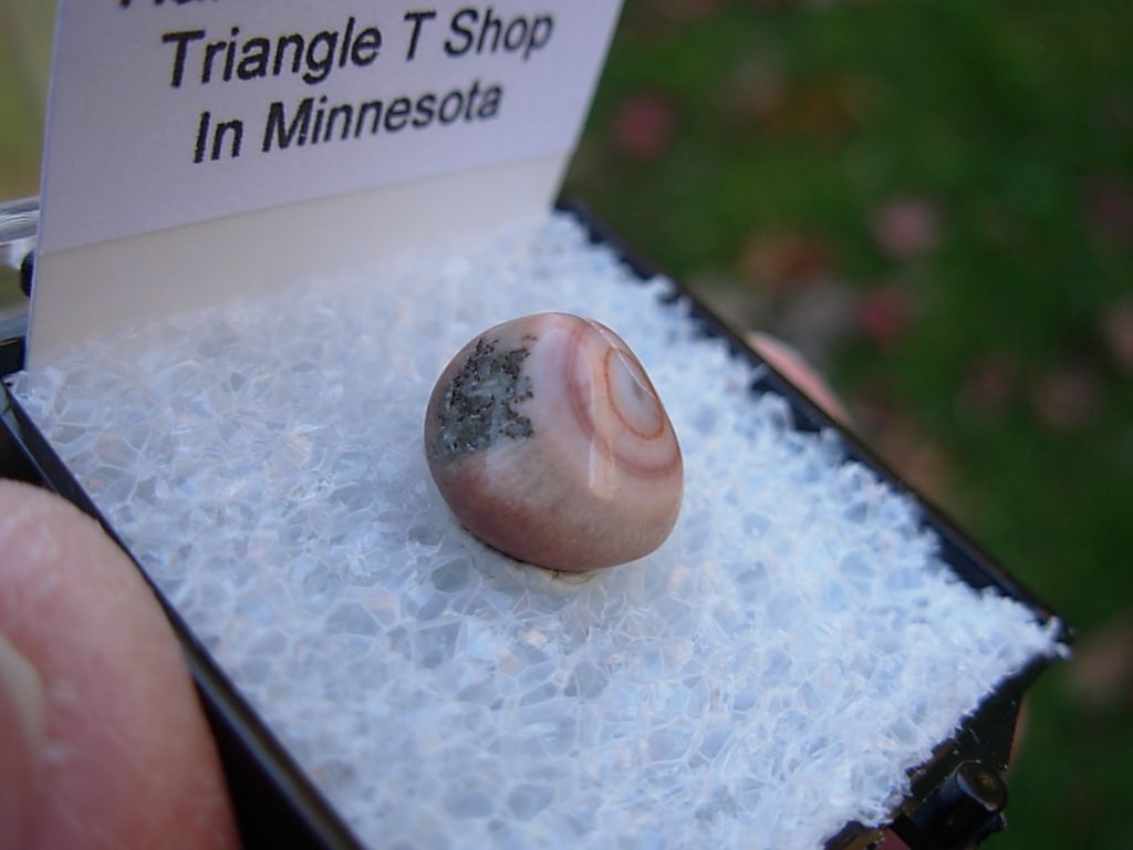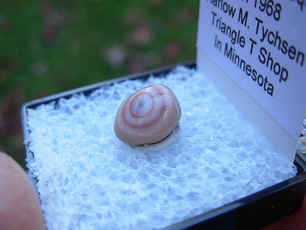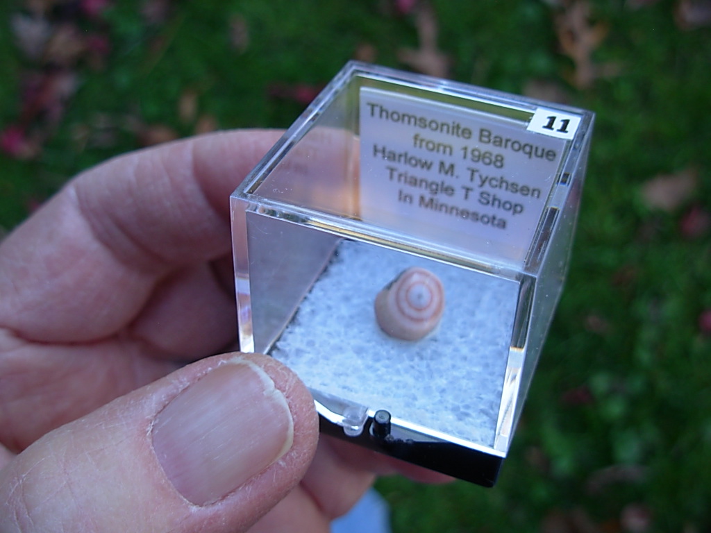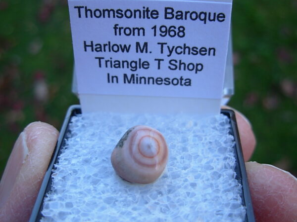 Minnesota Thomsonite is a RARE zeolite mineral found only at the Lake Superior shoreline SW of Grand Marais. This specimen is from Harlow Tyschen’s Triangle T Thomsonite Shop in 1968. He owned this locale from 1942 to 1974. This piece has not been available for over 57 years. It came from the John J Newton collection.