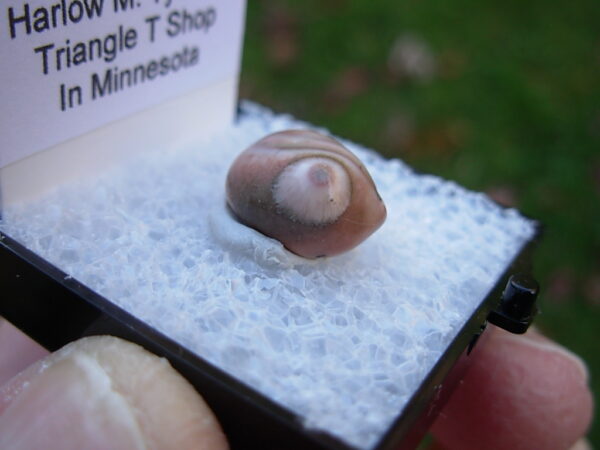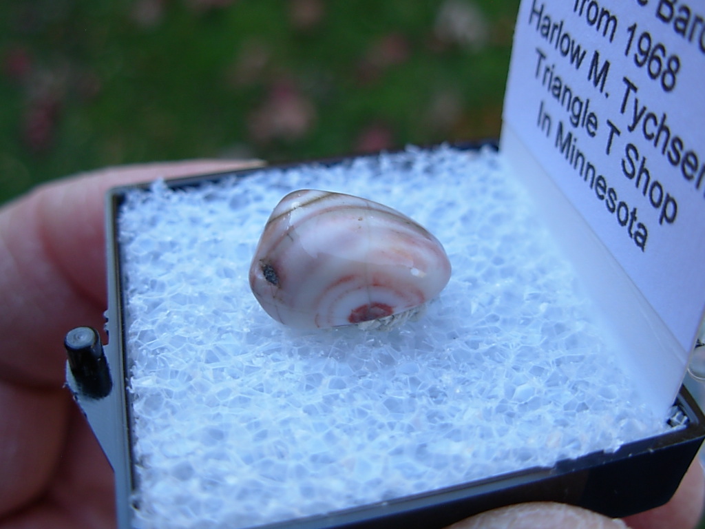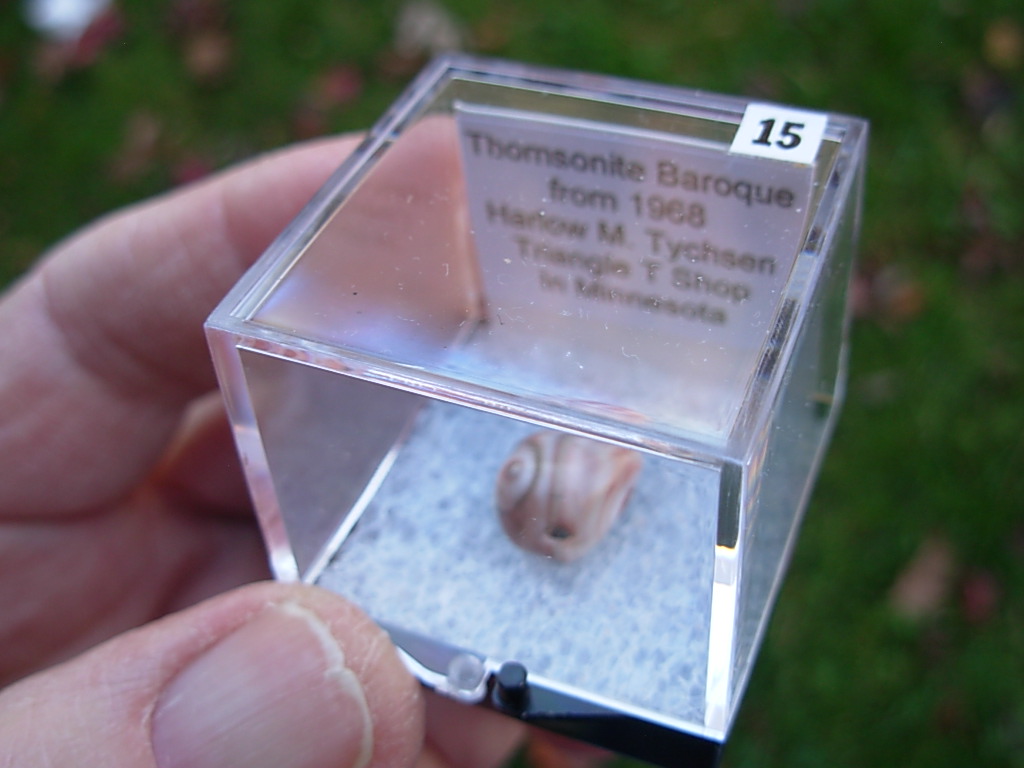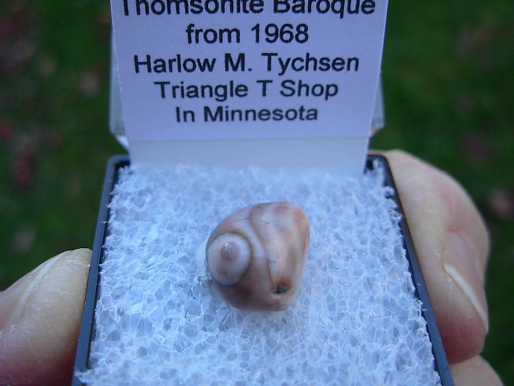 Minnesota Thomsonite is a RARE zeolite mineral found only at the Lake Superior shoreline SW of Grand Marais. This specimen is from Harlow Tyschen’s Triangle T Thomsonite Shop in 1968. He owned this locale from 1942 to 1974. This piece has not been available for over 57 years. It came from the John J Newton collection.