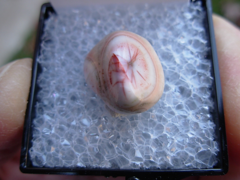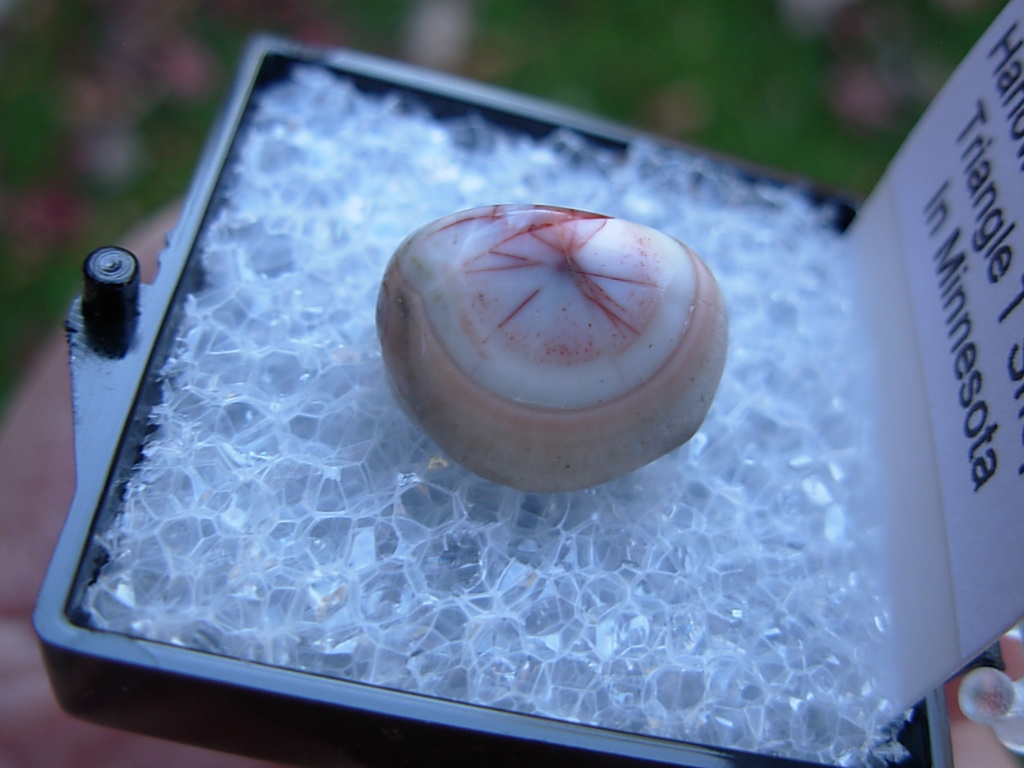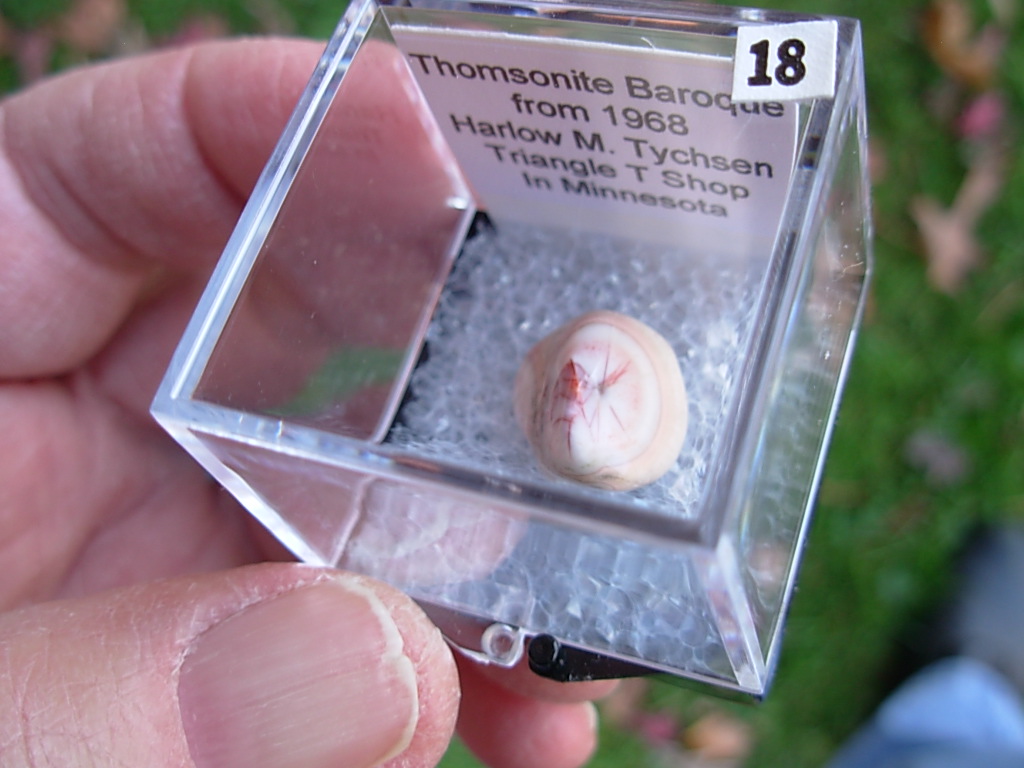 Minnesota Thomsonite is a RARE zeolite mineral found only at the Lake Superior shoreline SW of Grand Marais. This specimen is from Harlow Tyschen’s Triangle T Thomsonite Shop in 1968. He owned this locale from 1942 to 1974. This piece has not been available for over 57 years. It came from the John J Newton collection.