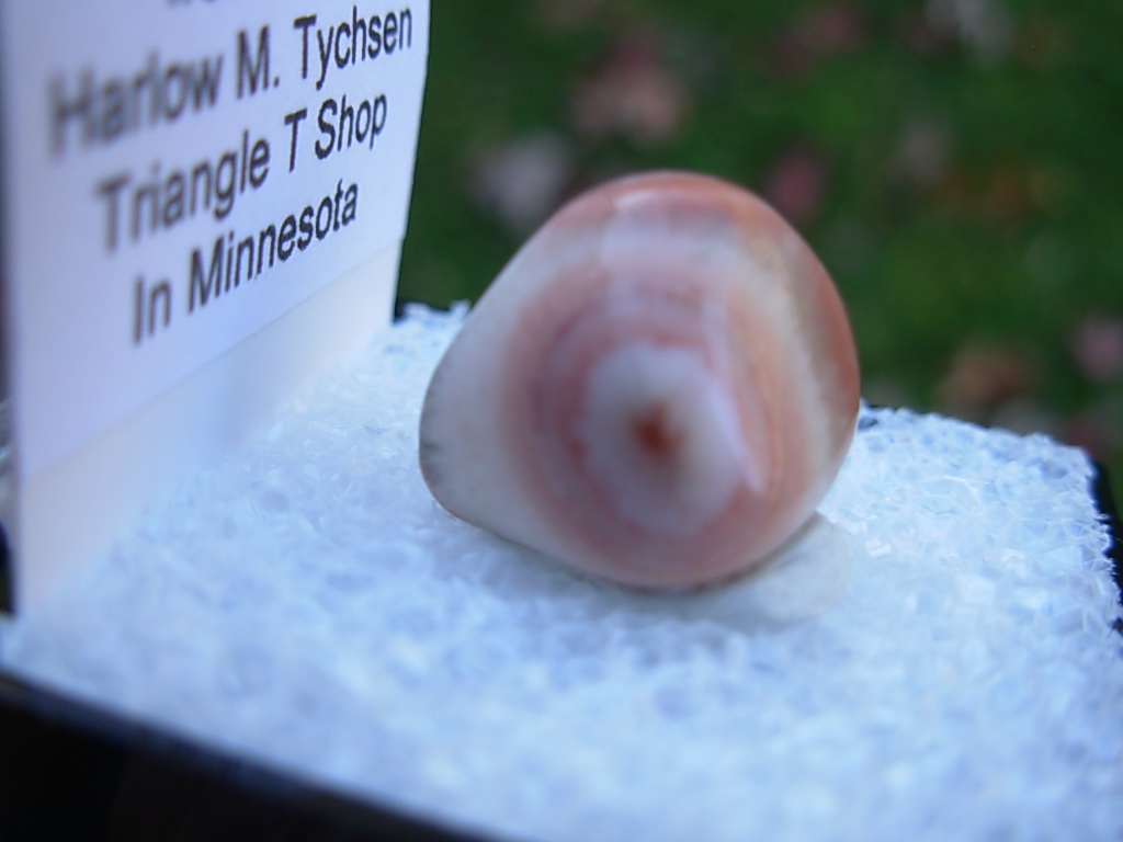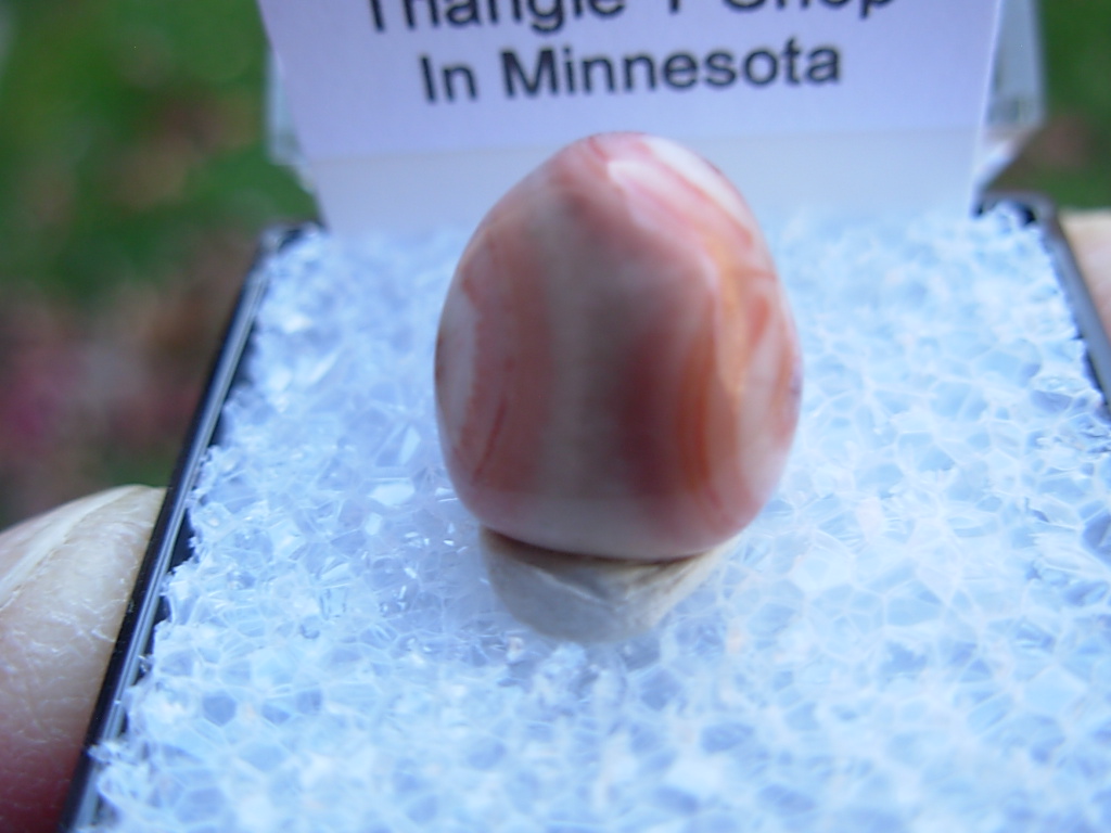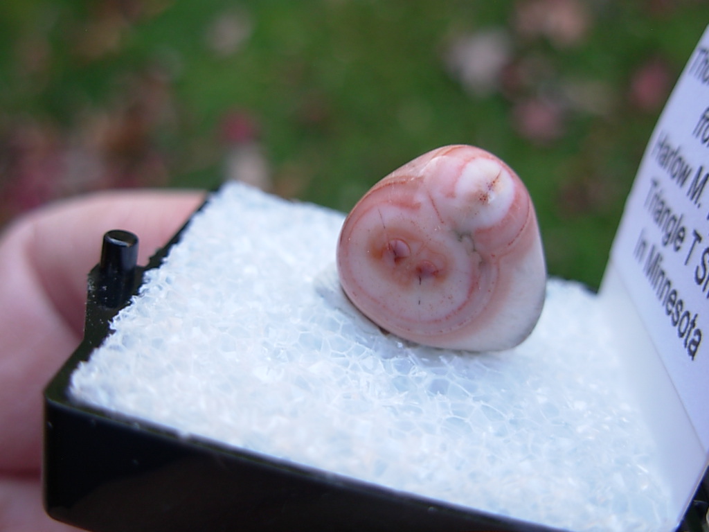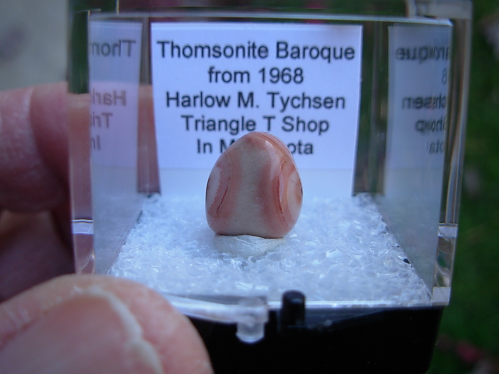 Minnesota Thomsonite is a RARE zeolite mineral found only at the Lake Superior shoreline SW of Grand Marais. This specimen is from Harlow Tyschen’s Triangle T Thomsonite Shop in 1968. He owned this locale from 1942 to 1974. This piece has not been available for over 57 years. It came from the John J Newton collection.