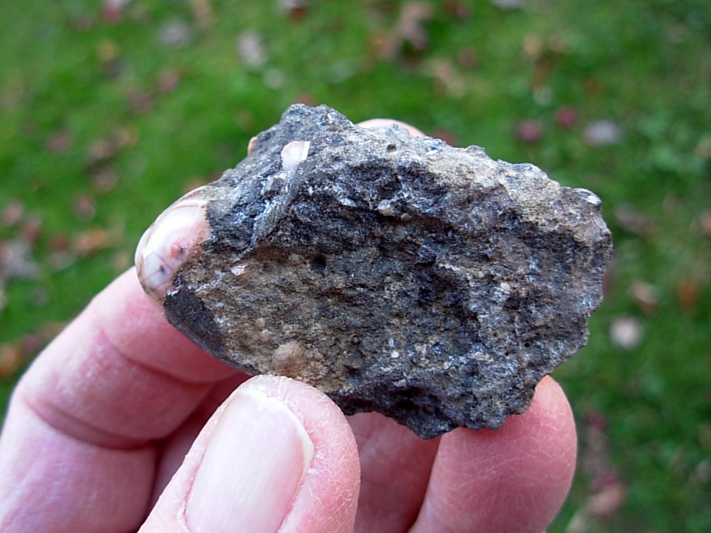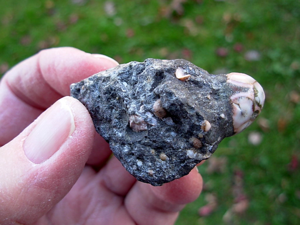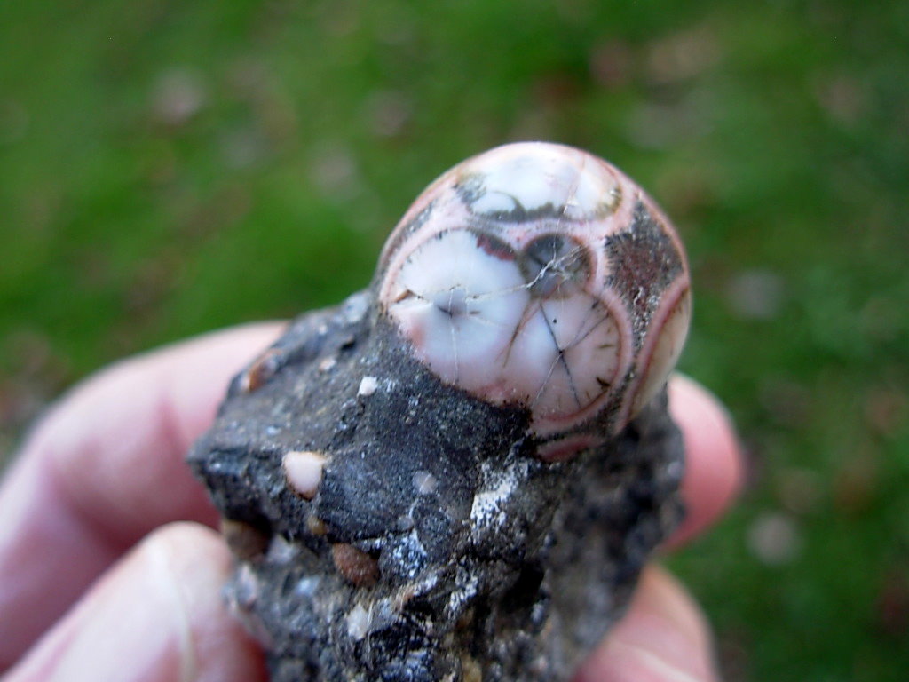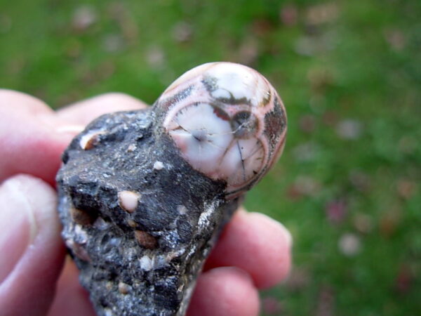 Minnesota Thomsonite is a RARE zeolite mineral found only at the Lake Superior shoreline SW of Grand Marais. This specimen has a single large polished dome Thomsonite (16.6 x 15.8 x 11.9mm) in a rough Basalt Matrix. The matrix has lots of small Thomsonite nodules visible. Digging the Thomsonite out of the Basalt is quite a process. This is how all the individual Thomsonite specimens were found. They were then dug out of the matrix and polished.