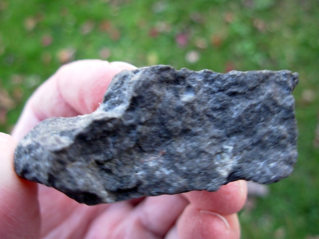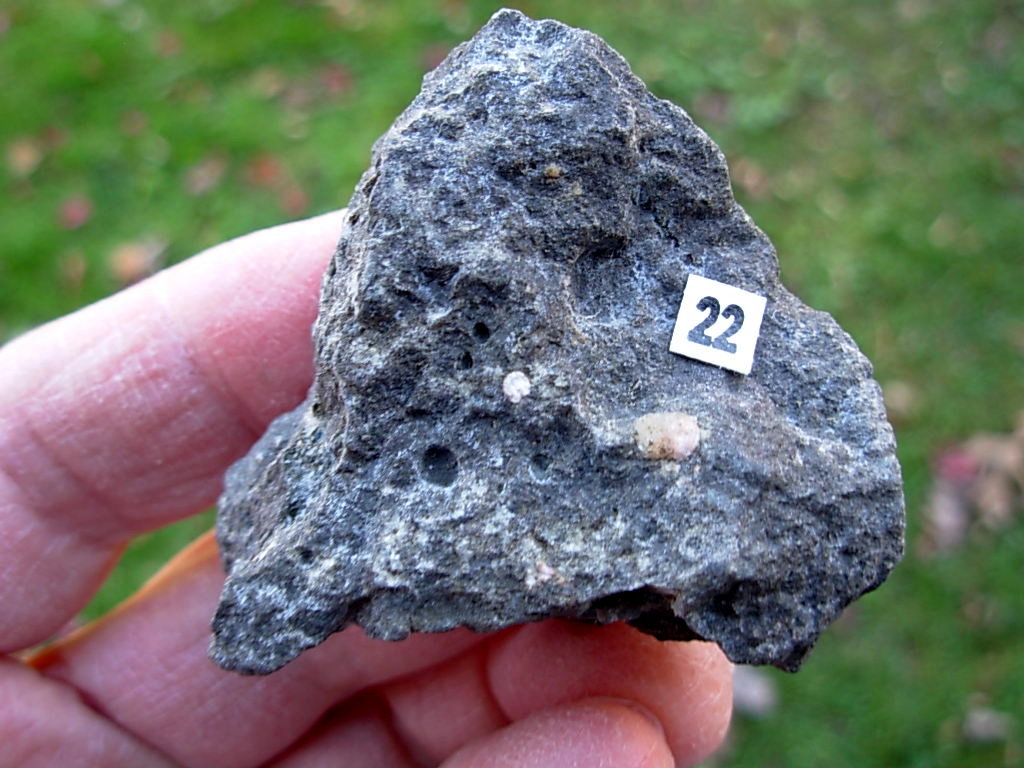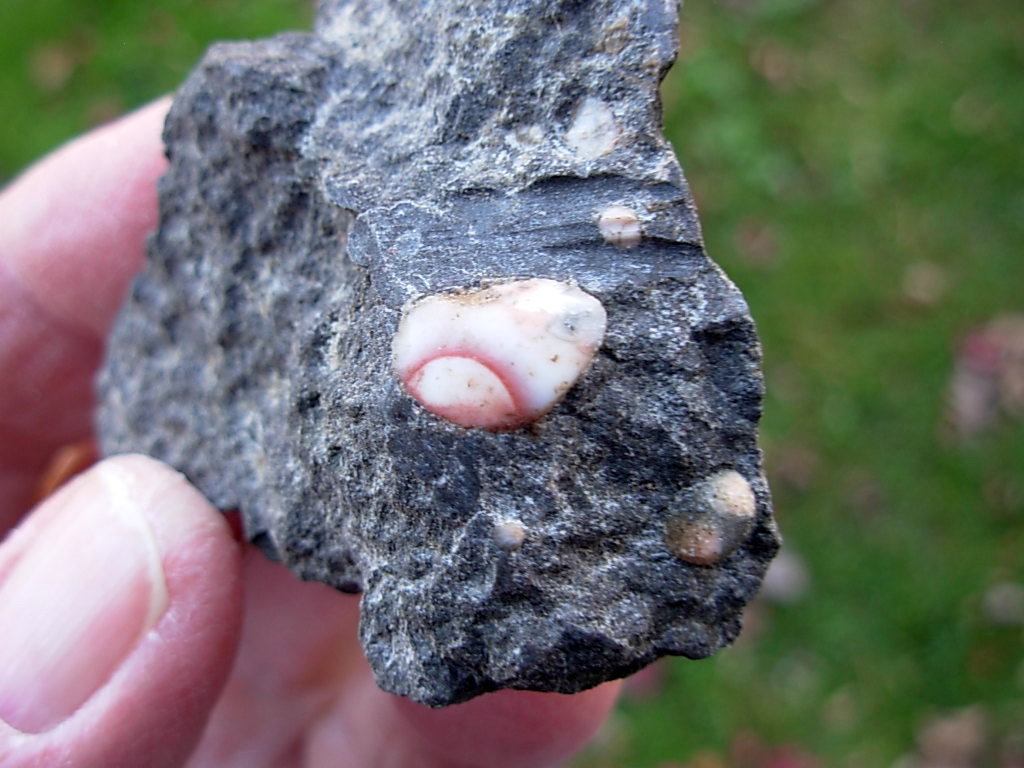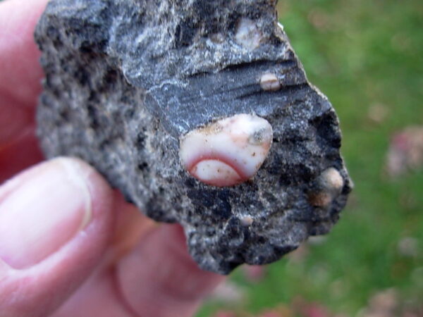 Minnesota Thomsonite is a RARE zeolite mineral found only at the Lake Superior shoreline SW of Grand Marais. This specimen has a single polished face Thomsonite (10.4 x 8.2mm) in a rough Basalt Matrix. The matrix has small Thomsonite nodules visible. Digging the Thomsonite out of the Basalt is quite a process. This is how all the individual Thomsonite specimens were found. They were then dug out of the matrix and polished.