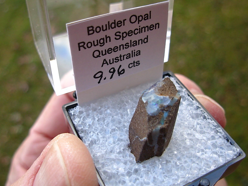 Rough specimen of Boulder Opal in Ironstone matrix from the Opal Fields in Queensland, Australia. This rare find is from the E&L Roth Collection. It has been placed in a Thumbnail display case with Identification tag