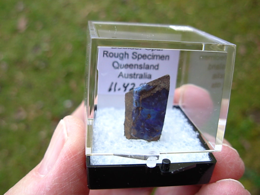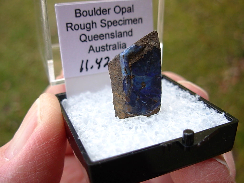 Rough specimen of Boulder Opal in Ironstone matrix from the Opal Fields in Queensland, Australia. This rare find is from the E&L Roth Collection. It has been placed in a Thumbnail display case with Identification tag