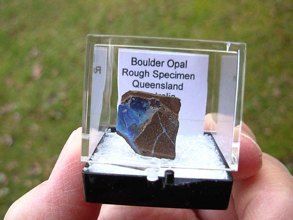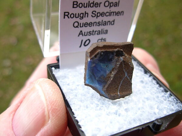 Rough specimen of Boulder Opal in Ironstone matrix from the Opal Fields in Queensland, Australia. This rare find is from the E&L Roth Collection. It has been placed in a Thumbnail display case with Identification tag