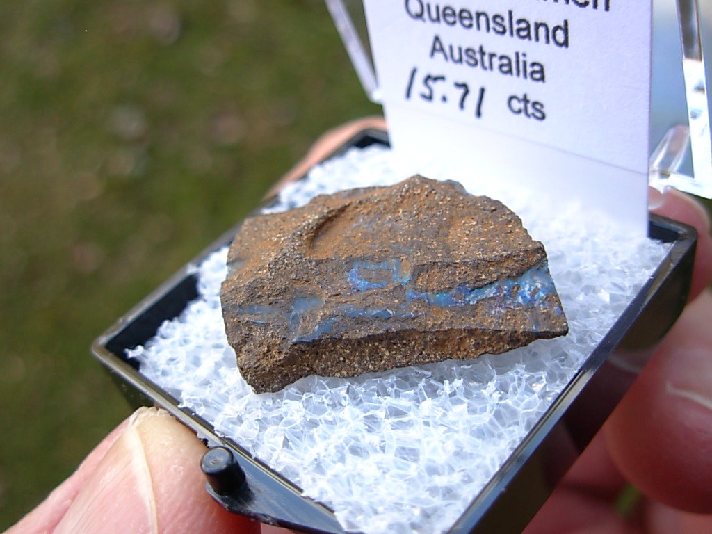 Rough specimen of Boulder Opal in Ironstone matrix from the Opal Fields in Queensland, Australia. This rare find is from the E&L Roth Collection. It has been placed in a Thumbnail display case with Identification tag