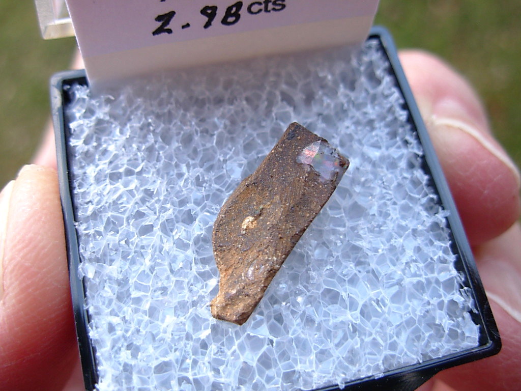 Rough specimen of Boulder Opal in Ironstone matrix from the Opal Fields in Queensland, Australia. This rare find is from the E&L Roth Collection. It has been placed in a Thumbnail display case with Identification tag