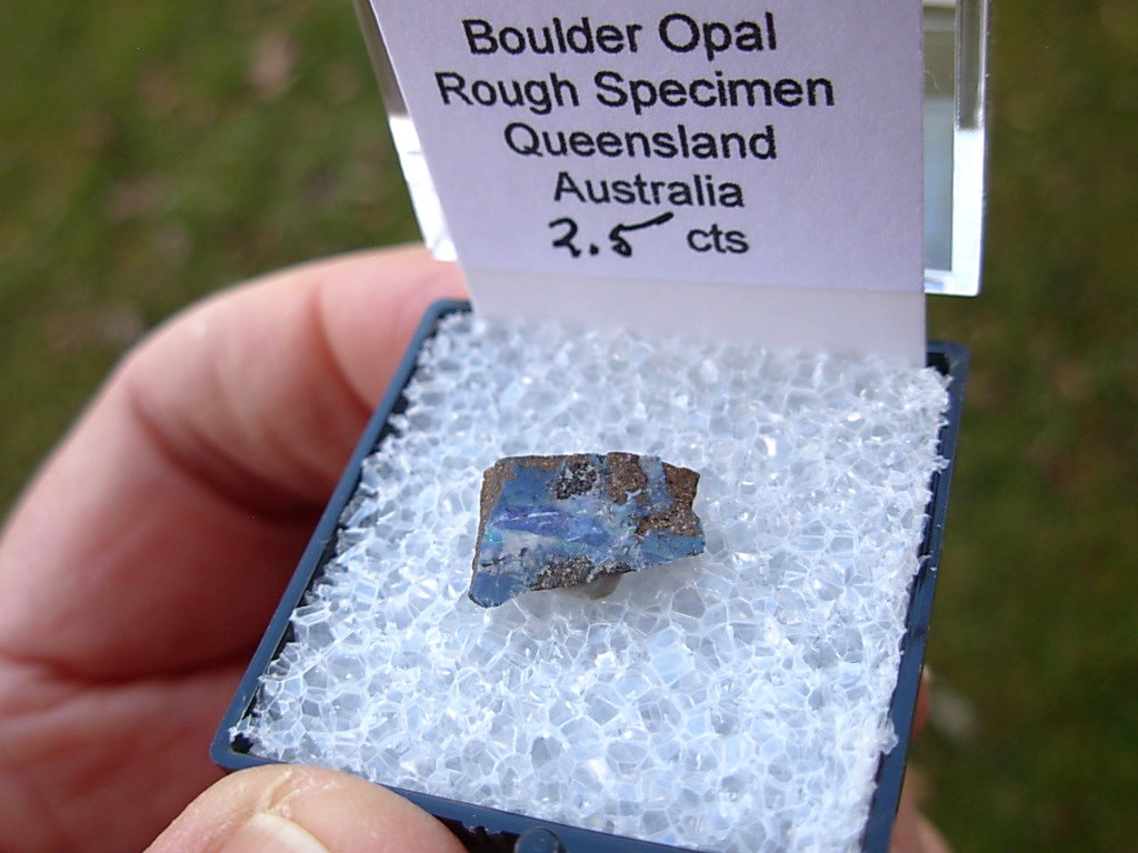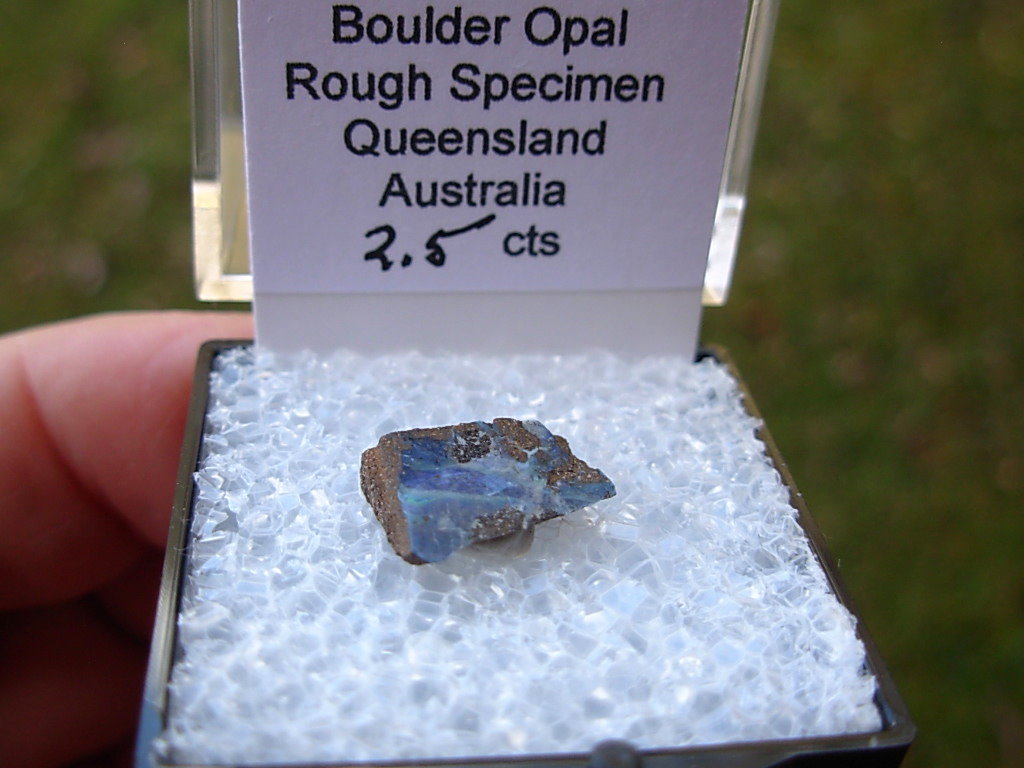 Rough specimen of Boulder Opal in Ironstone matrix from the Opal Fields in Queensland, Australia. This rare find is from the E&L Roth Collection. It has been placed in a Thumbnail display case with Identification tag