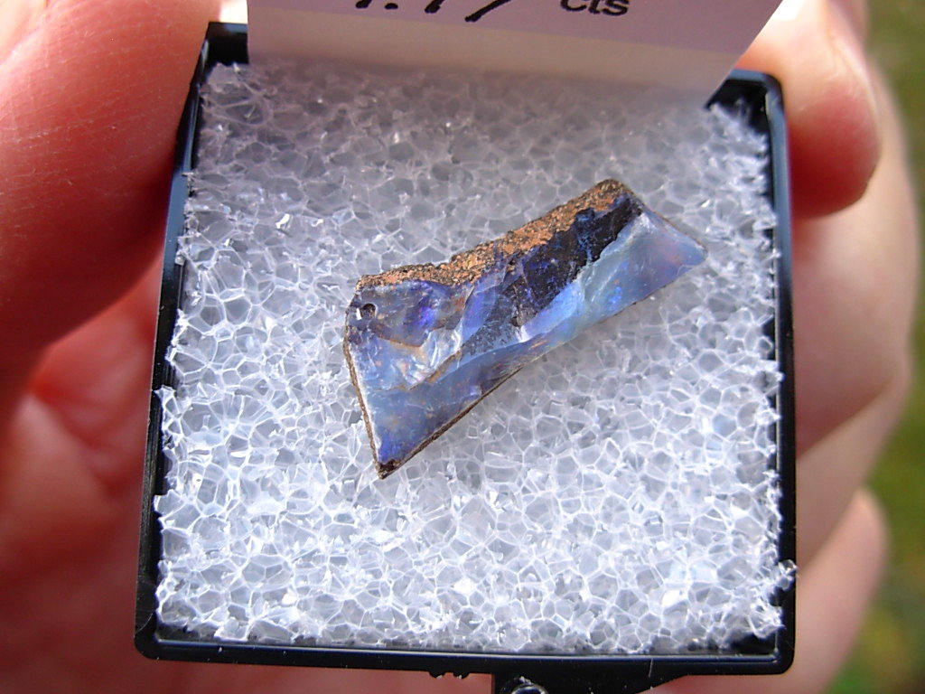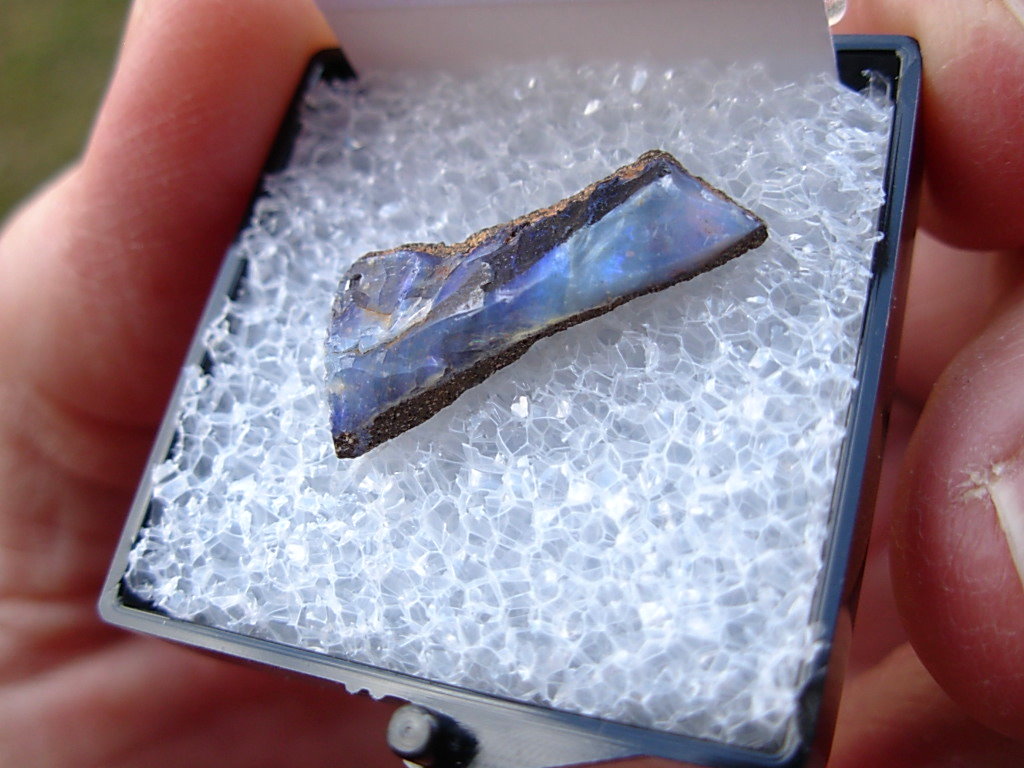 Rough specimen of Boulder Opal in Ironstone matrix from the Opal Fields in Queensland, Australia. This rare find is from the E&L Roth Collection. It has been placed in a Thumbnail display case with Identification tag