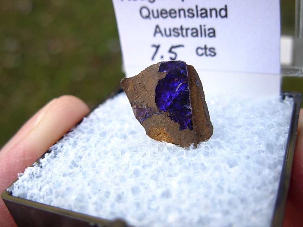 Rough specimen of Boulder Opal in Ironstone matrix from the Opal Fields in Queensland, Australia. This rare find is from the E&L Roth Collection. It has been placed in a Thumbnail display case with Identification tag