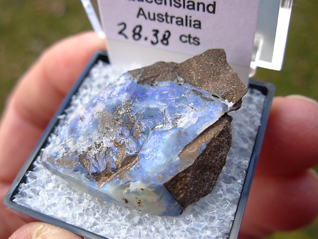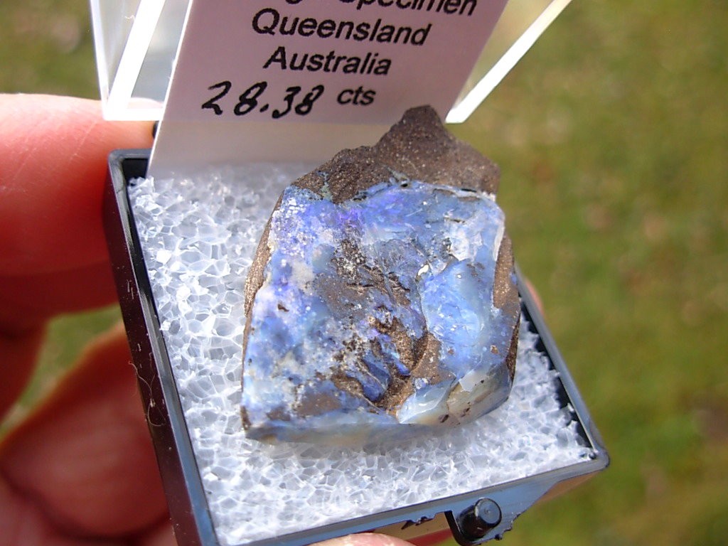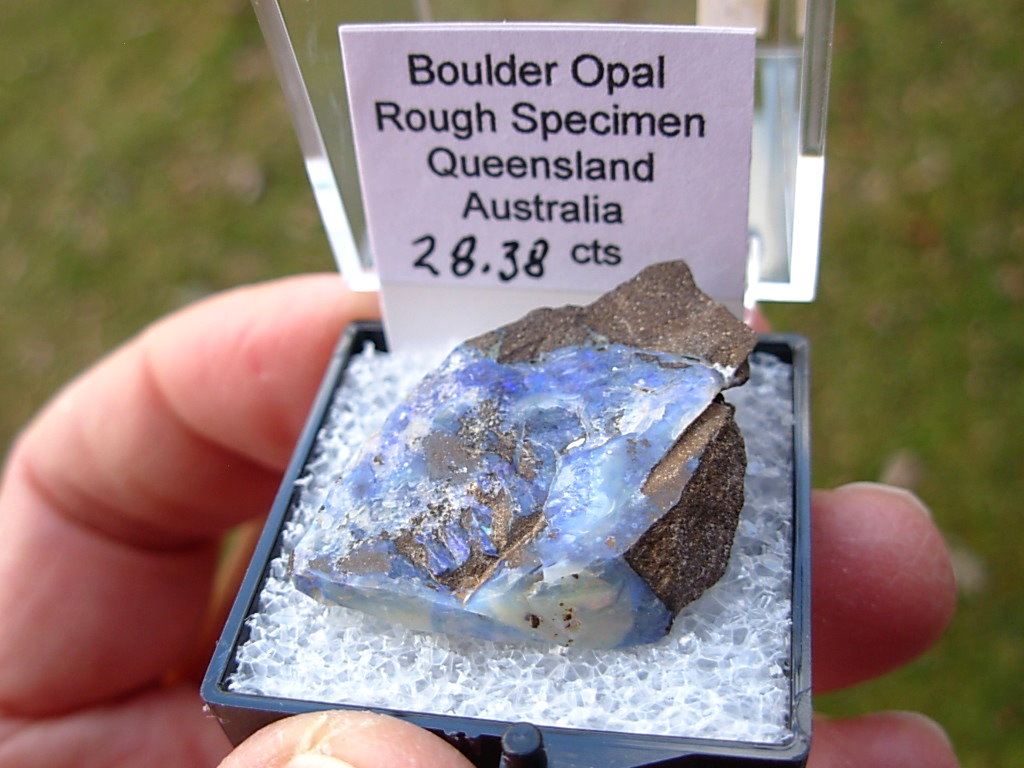 Rough specimen of Boulder Opal in Ironstone matrix from the Opal Fields in Queensland, Australia. This rare find is from the E&L Roth Collection. It has been placed in a Thumbnail display case with Identification tag