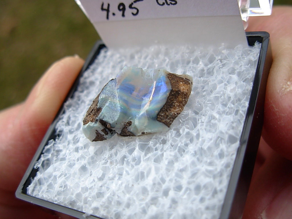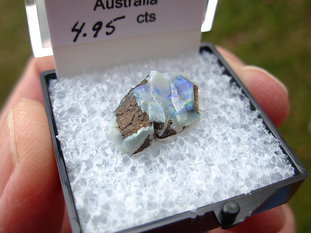 Rough specimen of Boulder Opal in Ironstone matrix from the Opal Fields in Queensland, Australia. This rare find is from the E&L Roth Collection. It has been placed in a Thumbnail display case with Identification tag