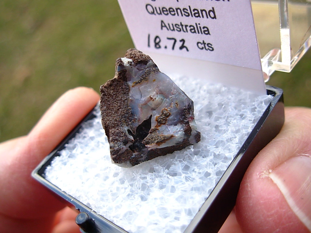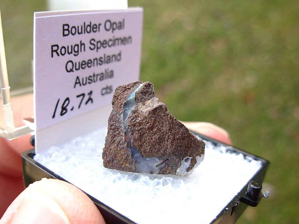 Rough specimen of Boulder Opal in Ironstone matrix from the Opal Fields in Queensland, Australia. This rare find is from the E&L Roth Collection. It has been placed in a Thumbnail display case with Identification tag